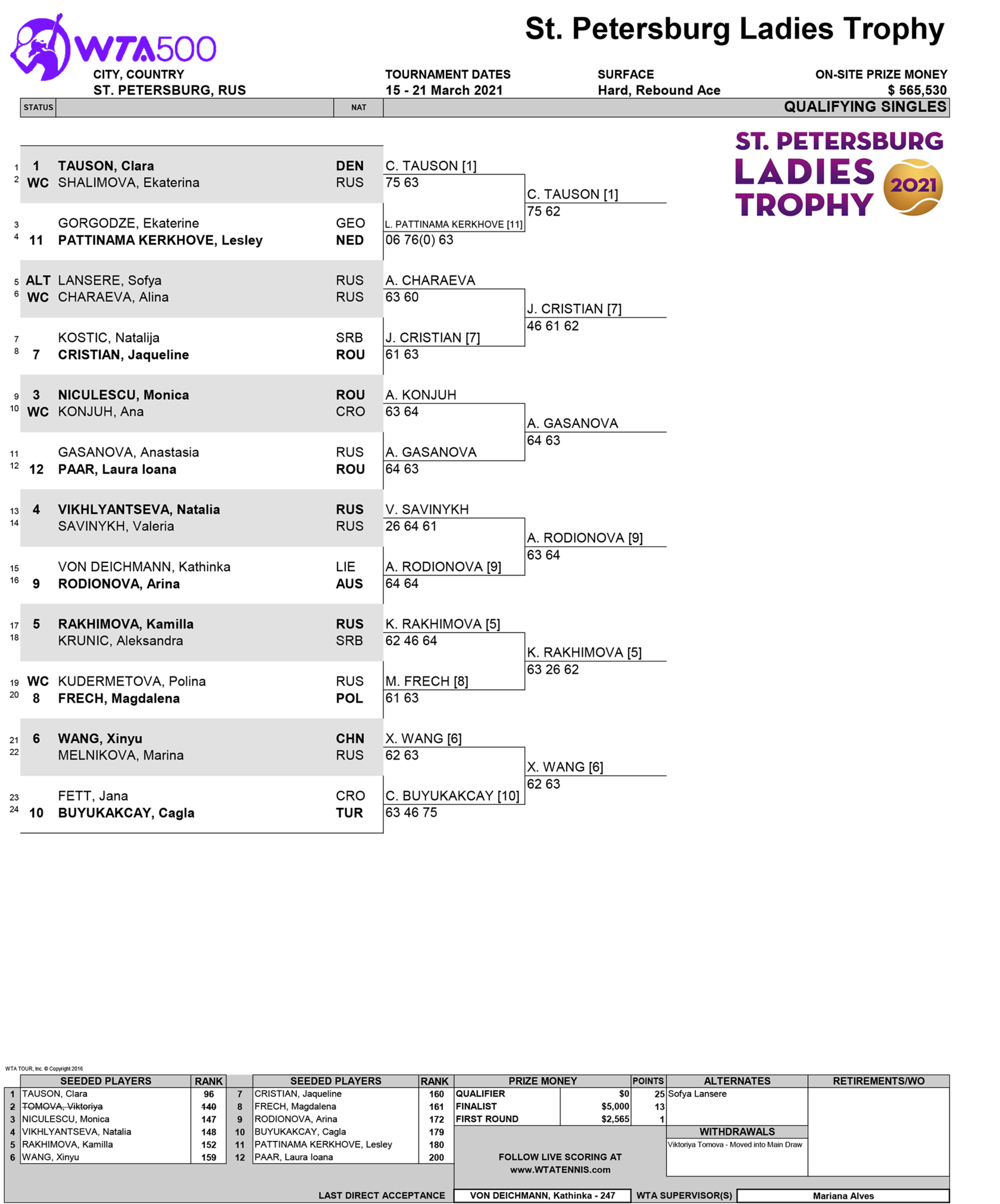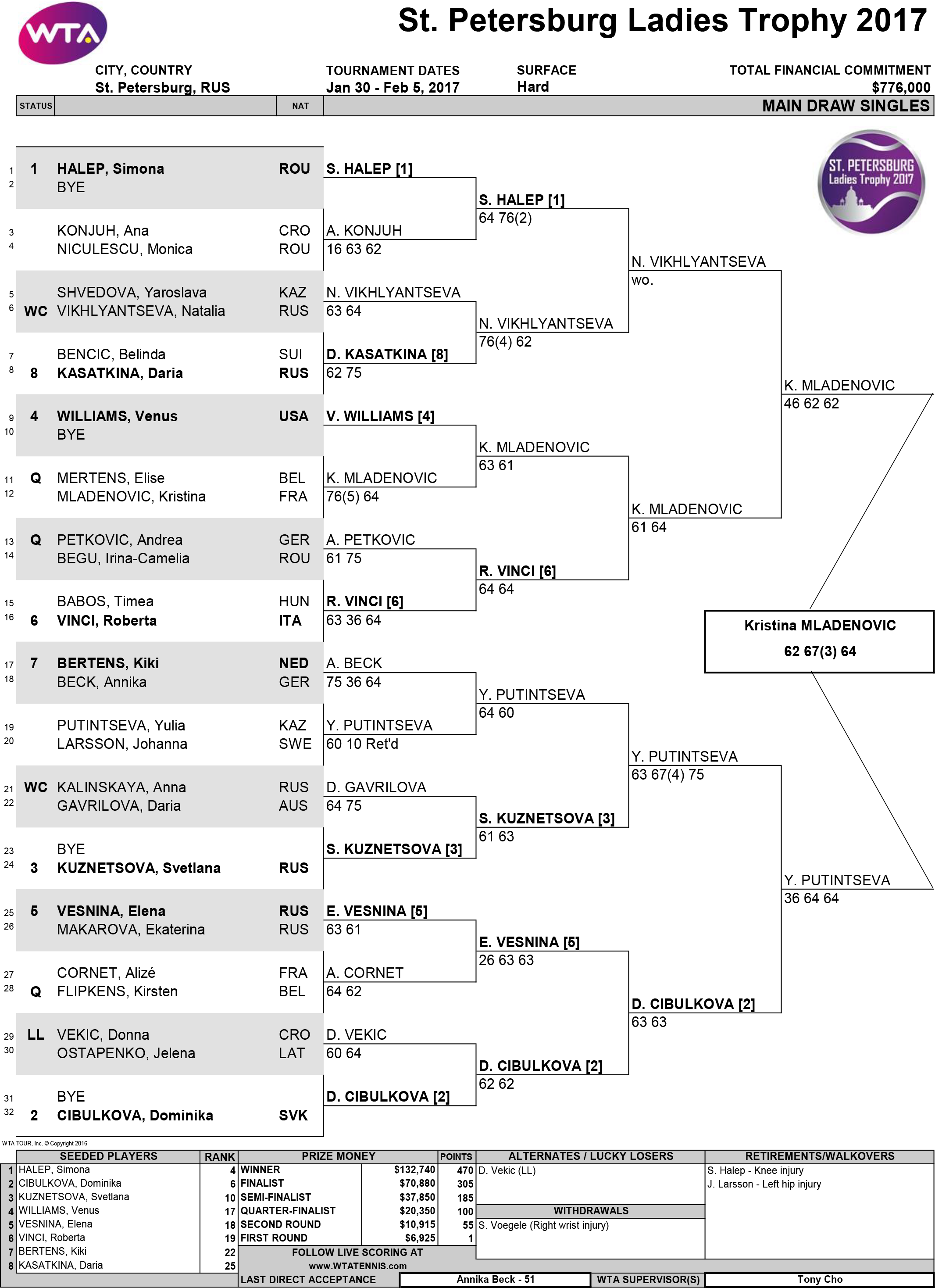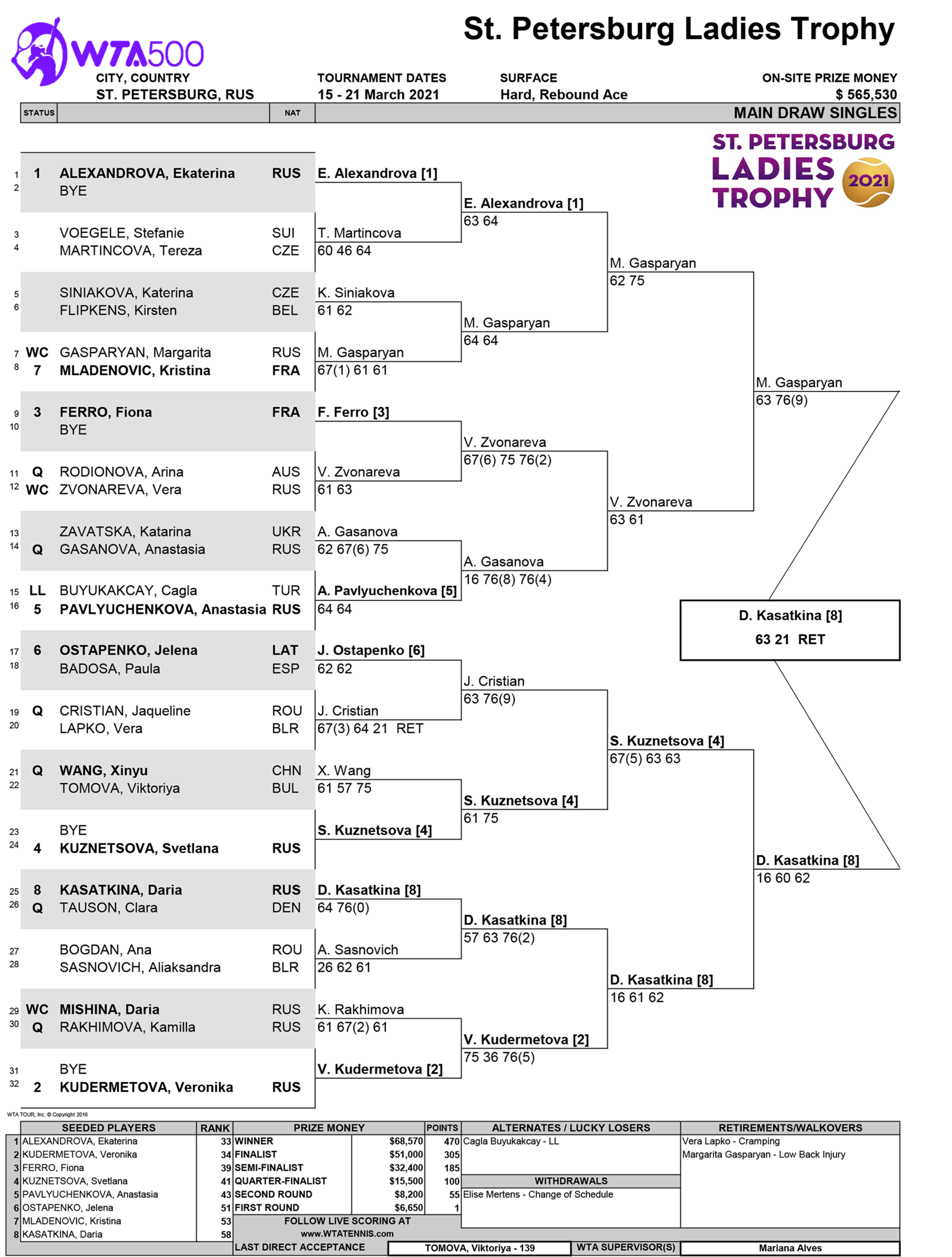 The St. Petersburg Ladies Trophy is a women's professional international tennis tournament held in winter in St. Petersburg since 2016 on indoor hard courts. It belongs to the WTA 500 series with a prize fund of about 700 thousand dollars and a tournament grid designed for 28 participants in singles and 16 pairs.